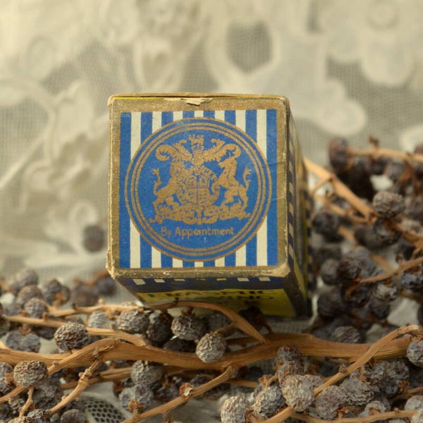 Leeg decortief ,blauw met geel vintage verpakkingsdoosje waar een scheerstick van het merk Erasmic in heeft gezeten vroeger