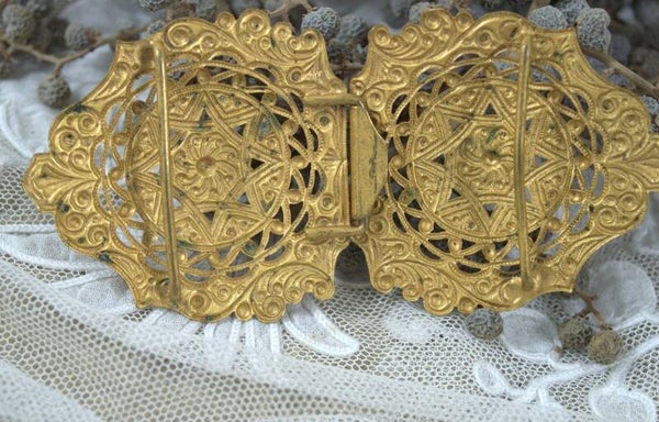 Prachtig sierlijke antieke goudkleurige metalen gesp.Ook nu nog heel goed te gebruiken als gesp of leuk om ter decoratie bij andere spulletjes te tonen