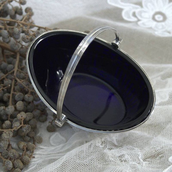 Vintage zilver plated mandje gemaakt door Walker & Hall in Engeland.Het mandje heeft een blauw glazen binnenbakje, er werd bijvoorbeeld suiker,snoepjes of bonbons in geserveerd .Leuk om bijvoorbeeld paaseitjes in te doen.Het glazen bakje heeft enkele beschadigingen aan de rand