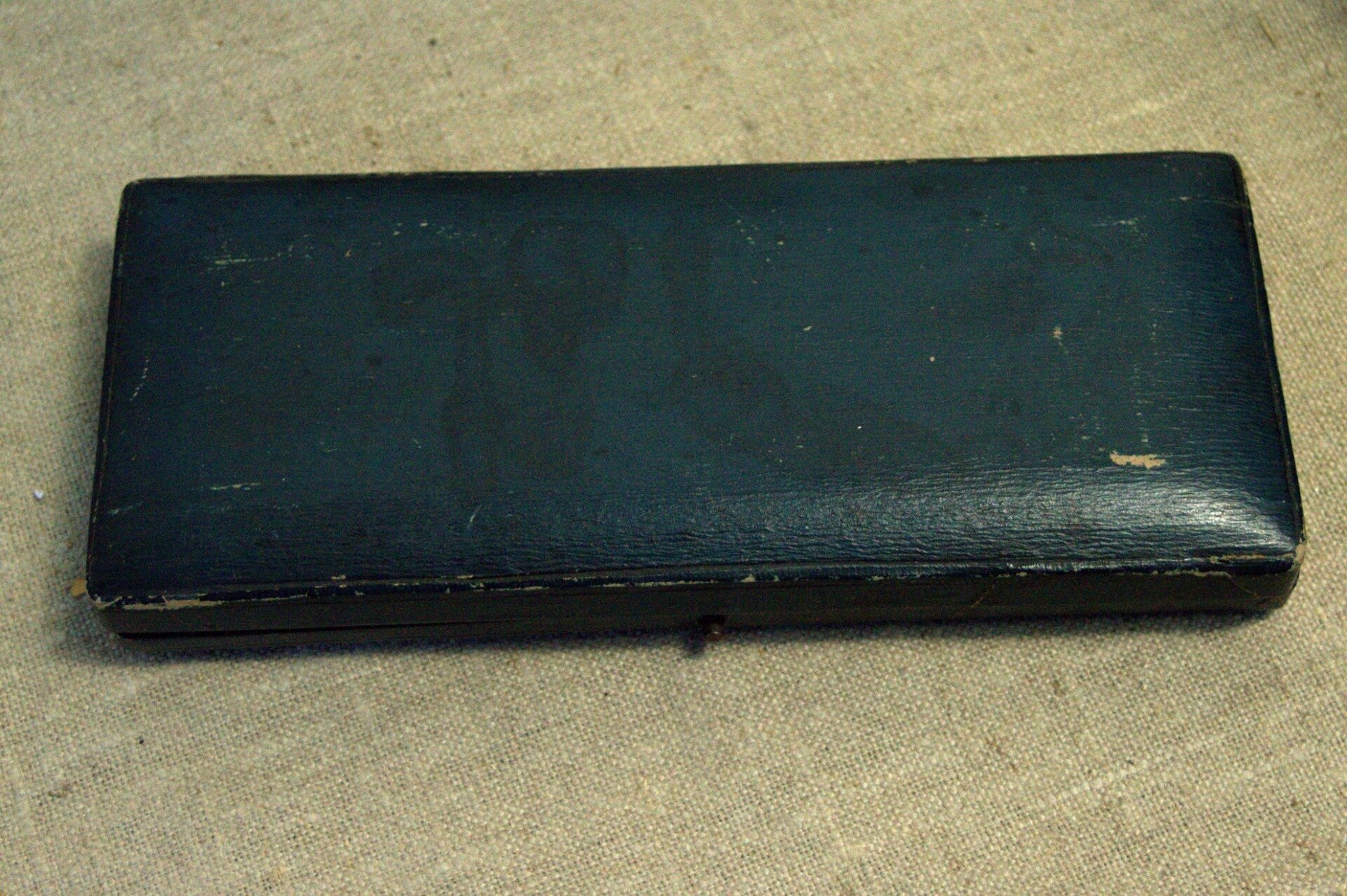 De set wordt zorgvuldig bewaard in een groene doos, waarvan de binnenzijde bekleed is met groen fluweel en satijn, wat de elegantie en de status van de items nog verder benadrukt. De afmetingen van de doos, 22x9x3 cm, zorgen voor een compacte maar beschermende opbergmethode, waardoor de set in uitstekende staat is gebleven door de jaren heen. Deze set is niet alleen een prachtig voorbeeld van antiek zilverwerk maar belichaamt ook de dagelijkse luxe van het vroege 20e-eeuwse leven.