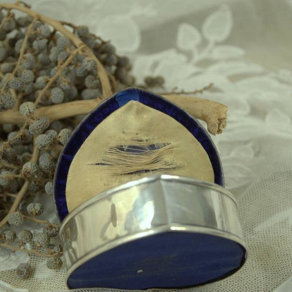Dit mooi hartvormig antiek speldenkussen met zijn originele sleets blauw fluwelen bovenzijde, spreekt boekdelen over de elegantie en verfijning van het begin van de 20e eeuw. Het zilverwerk is strak uitgevoerd en draagt de keurmerken van Birmingham uit het jaar 1909. Deze keurmerken fungeren niet alleen als een bewijs van authentiek zilverwerk, maar vertellen ook een verhaal over de oorsprong en de geschiedenis van dit unieke item.
