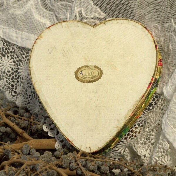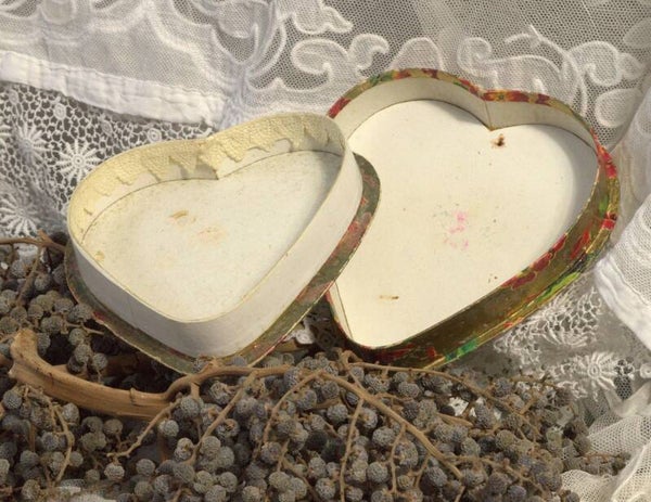 Lief brocante kartonnen chocolade doosje in hartvorm.Het goudkleurige met rood gekleurde bloemen bedrukte doosje komt uit de jaren 50.