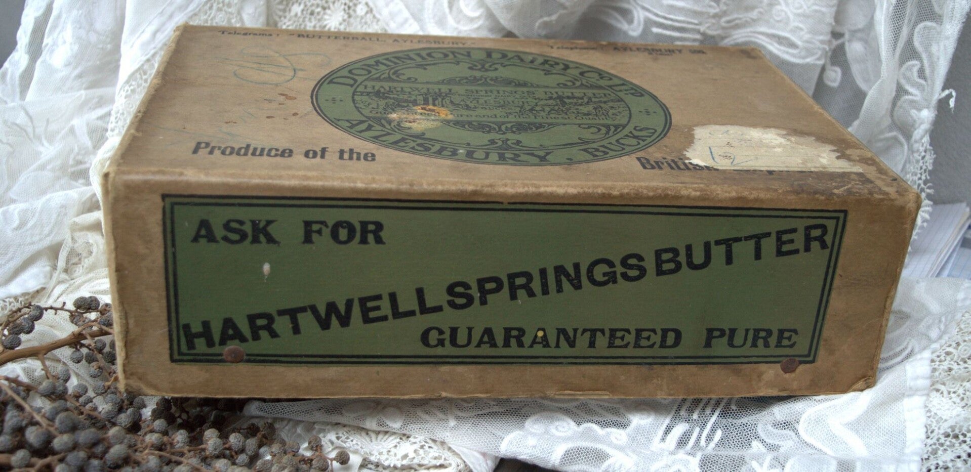 Vintage bruin kartonnen verpakking voor Engelse Hartwell spring butter