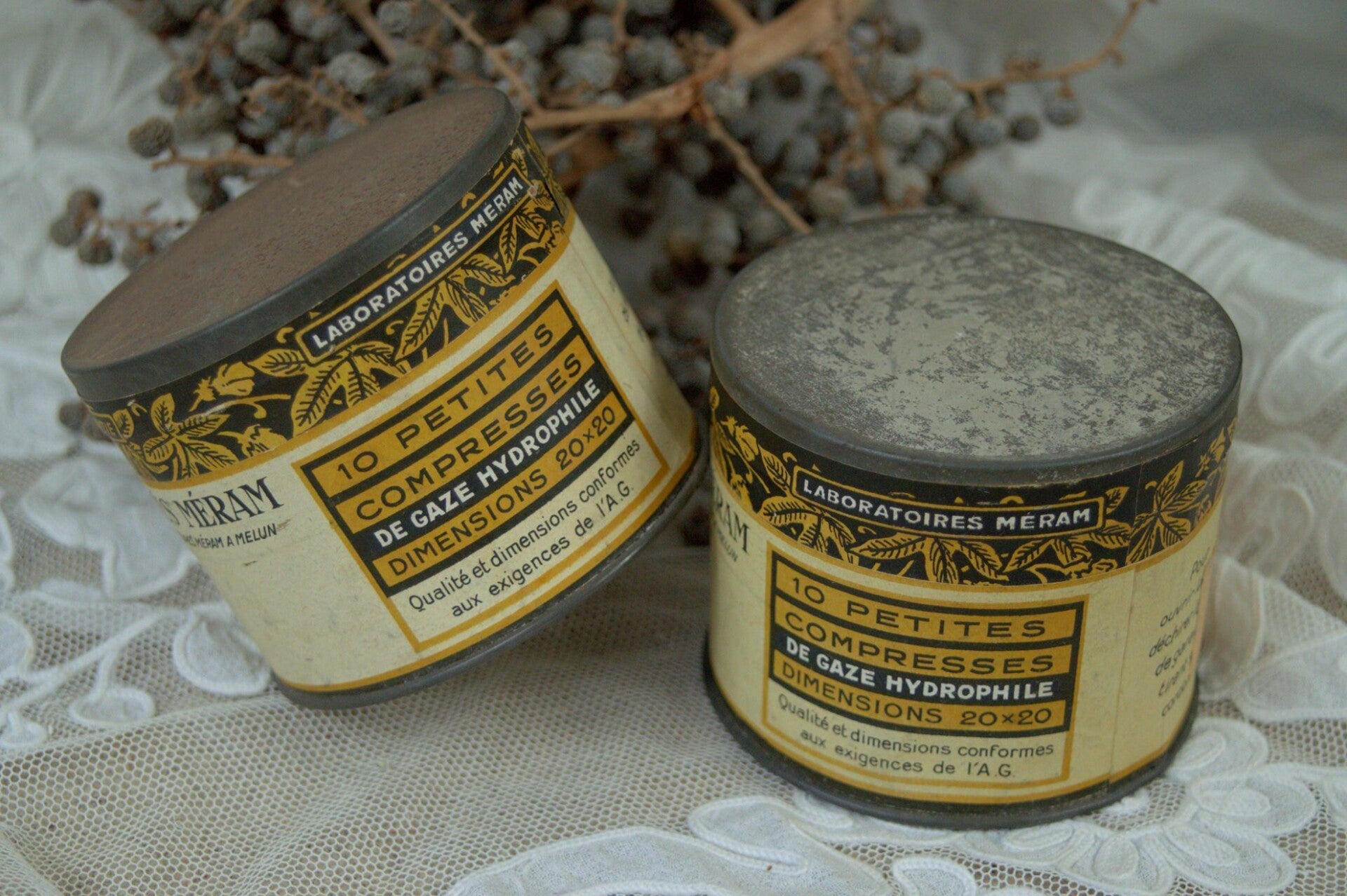 In dit ronde Frans vintage blikje dat nog nooit is opengemaakt, 10 gaas compressen.