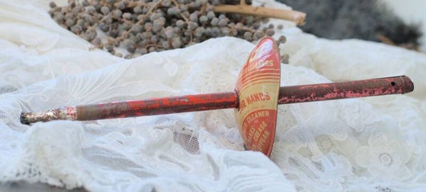 Rood metalen Engelse mop voor het schoonmaken van de oven van het merk Vel met beschermschild voor de hand.Leuk en apart item, wij hebben het nog niet eerder gezien.