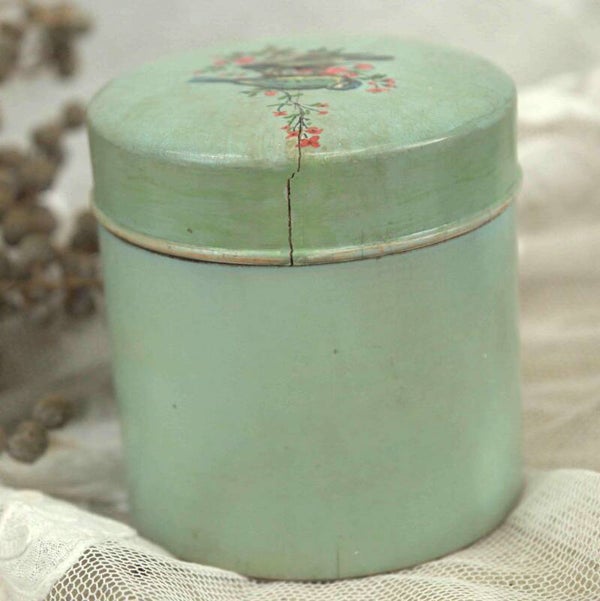 Lief mintgroen rond potje met afbeelding vogeltjes op het dekseltje. Het potje is van hout en werd gebruikt om een poederdonsje in te bewaren. Het dekseltje heeft een scheurtje.