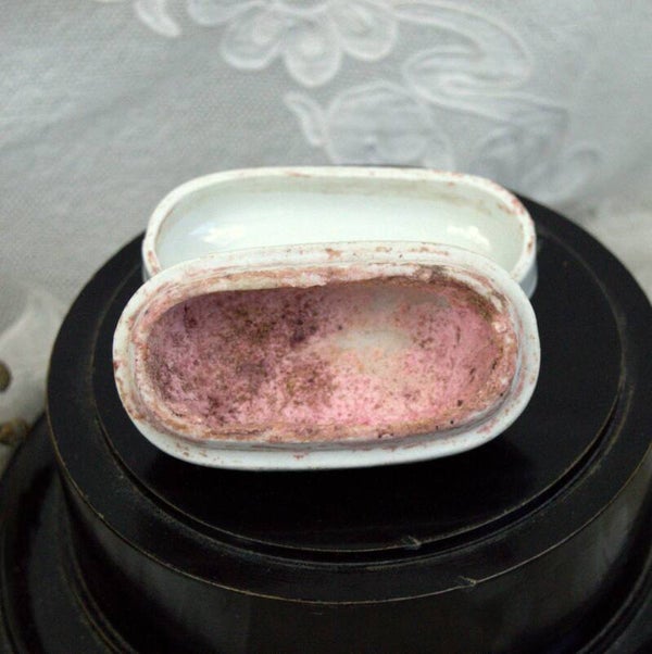 Antiek Frans ovaal wit porseleinen doosje waar tandpoeder in werd bewaard. Het potje is in goede staat en bevat nog wat tandpoeder.