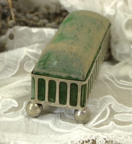 Antiek sleets zilverplated speldenkussen van groen fluweel