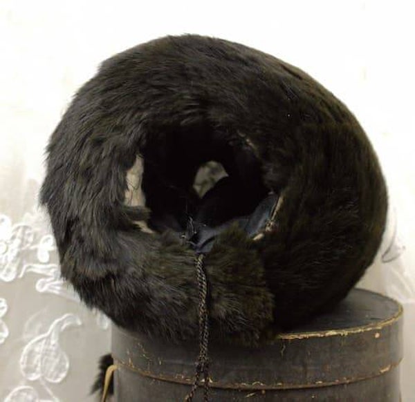 De mof is gemaakt van heel donker buin/zwart langharig bont, is gevoerd met zwart satijn, opgevuld met een dikke warme stof en versierd met kwasten aan beide zijden.