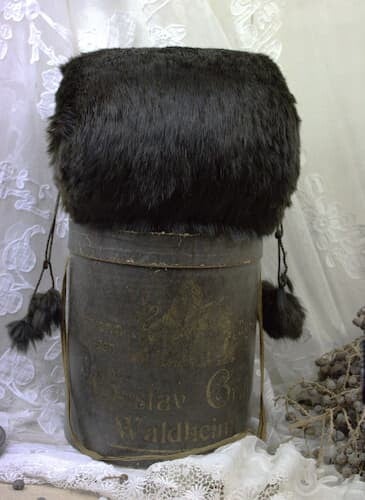 Ook de originele zwarte opbergdoos is nog aanwezig en laat zien dat de mof is gemaakt dooor de Duitse Gustav Gräl uit Waldheim in het begin van de 20e eeuw.