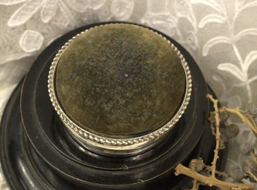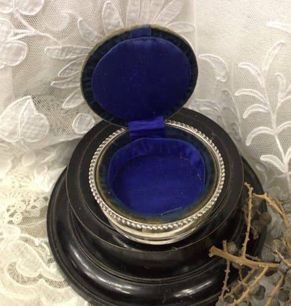 Antiek ronde Engels zilveren spelden/ sieraden doos uit 1898