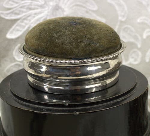 Antiek spelden kussen uitgevoerd in mooi strak zilver met gedraaide rand aan de bovenzijde. Het sleets fluwelen kussentje is veelvuldig gebruikt om spelden in te prikken.